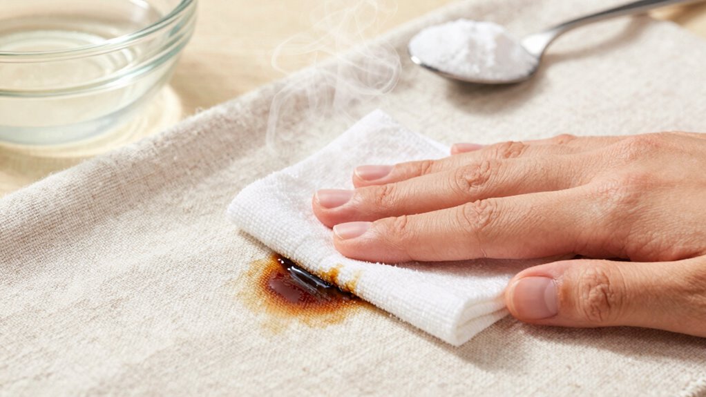 If you spill coffee on fabric, act fast by blotting the stain with a clean cloth or paper towel and rinse it with cold water from the back to push out the stain. Avoid rubbing and never use hot water, as it can set the stain. Use mild detergent, vinegar solution, or a stain remover for stubborn spots. To prevent permanent marks, wait to dry until the stain is fully gone. Keep exploring for more helpful tips.