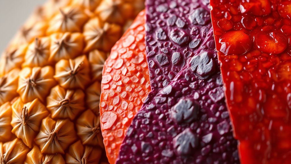 Piñatex and fruit leathers from pineapple leaves are innovative, eco-friendly fabrics made from natural fibers that would otherwise be waste. By transforming pineapple leaf fibers into durable, leather-like materials, these textiles reduce environmental impact, save water and energy, and avoid harmful chemicals. They’re versatile for clothing, accessories, and home decor, inspiring sustainable design. To discover how these materials are shaping a greener future in fashion and beyond, keep exploring their exciting potential.
