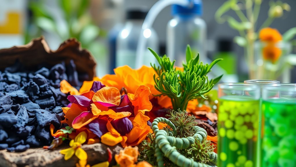Exploring sustainable dye sources reveals eco-friendly options like natural dyes derived from plants, minerals, or insects, which are renewable and biodegradable, reducing water and chemical use. Dope dyes involve adding pigments during fiber production, cutting waste and energy consumption. Microbial dyes, produced by bacteria, fungi, or algae, turn waste into vibrant colorants with minimal environmental impact. To discover more about how these innovative dyes can transform textile sustainability, continue exploring these eco-conscious solutions.