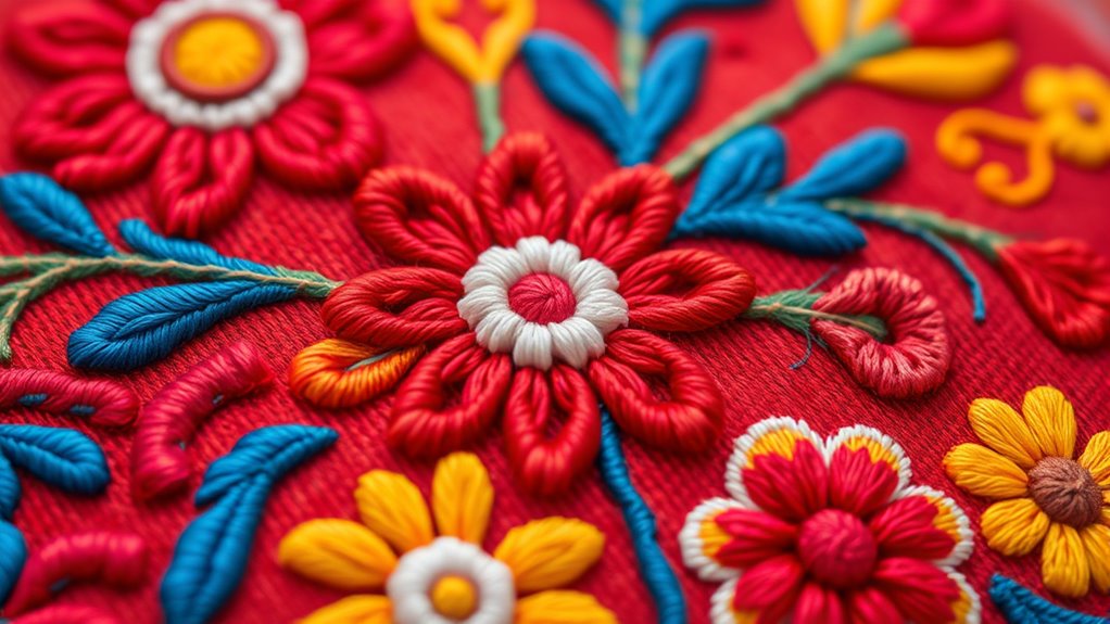 Otomi embroidery is vibrant Mexican folk art that uses intricate hand stitches to create colorful designs full of cultural symbolism. You’ll see motifs like animals, plants, and celestial symbols that tell stories, reflect beliefs, and preserve Otomi traditions. Bright natural dyes enhance these textiles, making each piece both beautiful and meaningful. If you want to explore how these intricate designs reveal Otomi spirituality and heritage, there’s more to uncover behind each stitch.