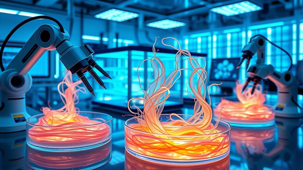 Biofabrication is a cutting-edge field that combines biology, engineering, and materials science to create functional biological tissues and structures. As you explore this innovative area, you’ll find that synthetic biology plays a vital role in designing living materials that can mimic natural tissues. Synthetic biology allows scientists to reprogram cells or engineer new biological parts, enabling the production of complex tissues like leather and fibers directly in the lab. These advancements are transforming how we think about manufacturing, moving away from traditional animal farming or synthetic substitutes toward more sustainable, lab-grown alternatives.
