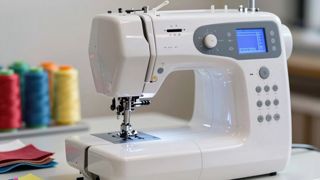A computerized sewing machine typically lasts around 10 years, depending on usage and maintenance. Its lifespan can be extended with proper care, like regular cleaning and timely software updates. Advanced features, such as automatic needle threading or embroidery functions, may require occasional updates to keep them working smoothly. Investing in quality and following manufacturer guidelines helps guarantee your machine remains reliable and functional for many years.