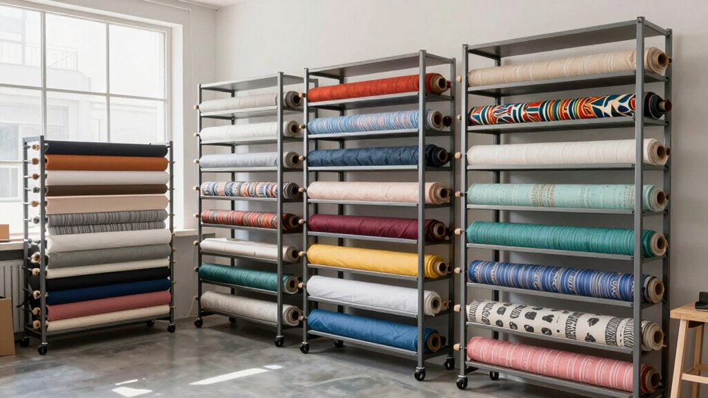 Rack customization is another standout feature to evaluate. No two studios are the same, so having a rack that can be tailored to your specific needs is a game-changer. Adjustable shelves, removable bars, and modular components allow you to organize your fabrics by color, weight, or project. Custom racks help you optimize space, making it easier to add new bolts or reconfigure your setup as your collection grows. With rack customization, you can design a storage system that fits perfectly into your studio layout, improving efficiency and reducing clutter. Additionally, material durability ensures your racks remain reliable despite frequent adjustments or movement. Incorporating sustainable materials and practices in your choices can also promote environmentally friendly materials and practices in your studio setup.