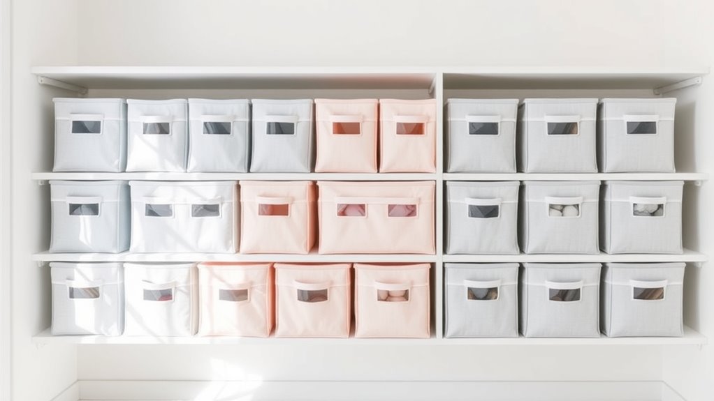 Have you considered how your storage environment might affect the dust-proof effectiveness of fabric bins? Humidity and temperature levels play a significant role; excess moisture can weaken fabrics and reduce their dust resistance. Avoid storing bins in direct sunlight, as UV exposure can degrade fibers over time, making them less effective. It’s also important to determine if you need additional dust protection features like sealed zippers or cover flaps to keep dust out completely. Consider whether pests or insects might be an issue—select bins made from pest-resistant materials or with secure closures. Finally, verify there’s enough airflow around the bins to prevent mold growth and preserve the fabric’s integrity. A well-maintained environment helps your dust-proof bins work their best.