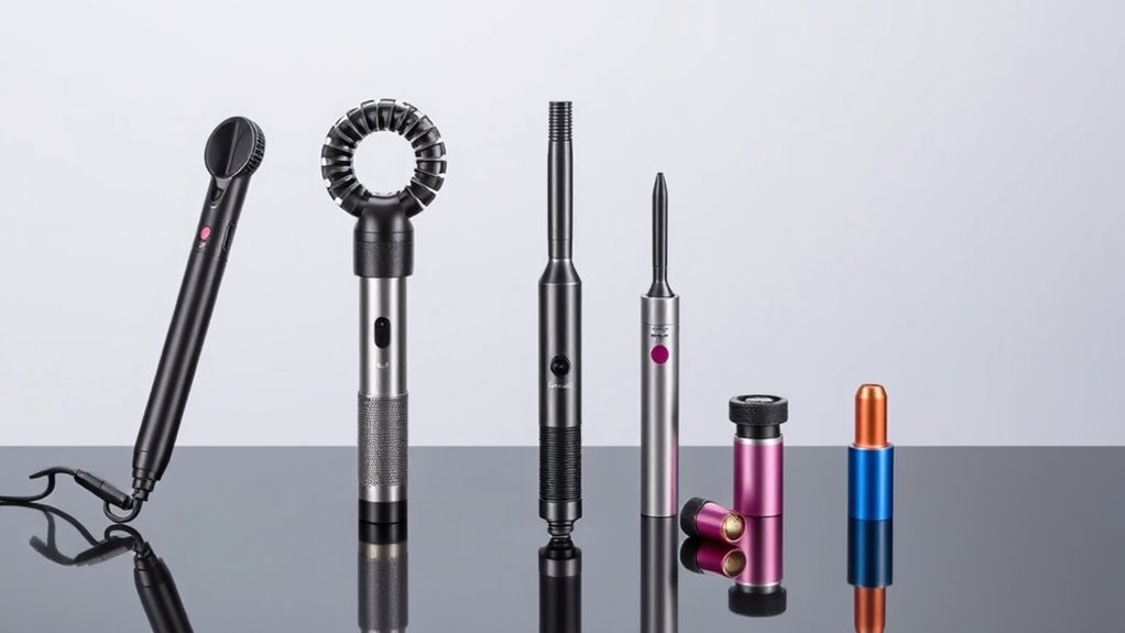 To prevent heat damage with Dyson Airwrap alternatives, I focus on features that monitor and control temperature effectively. I look for tools with intelligent heat sensors that adjust in real-time, preventing overheating. Ceramic or tourmaline ionic technology helps distribute heat evenly, reducing hot spots that can damage hair. Adjustable temperature controls are essential, so I can choose lower settings for gentler styling. Rapid heat recovery systems maintain consistent heat levels, minimizing thermal trauma. Additionally, cool shot or cool air settings help lock in styles and reduce heat exposure after styling. These features work together to protect hair health while delivering effective styling. Prioritizing heat damage prevention ensures I get the look I want without compromising the condition of my hair.