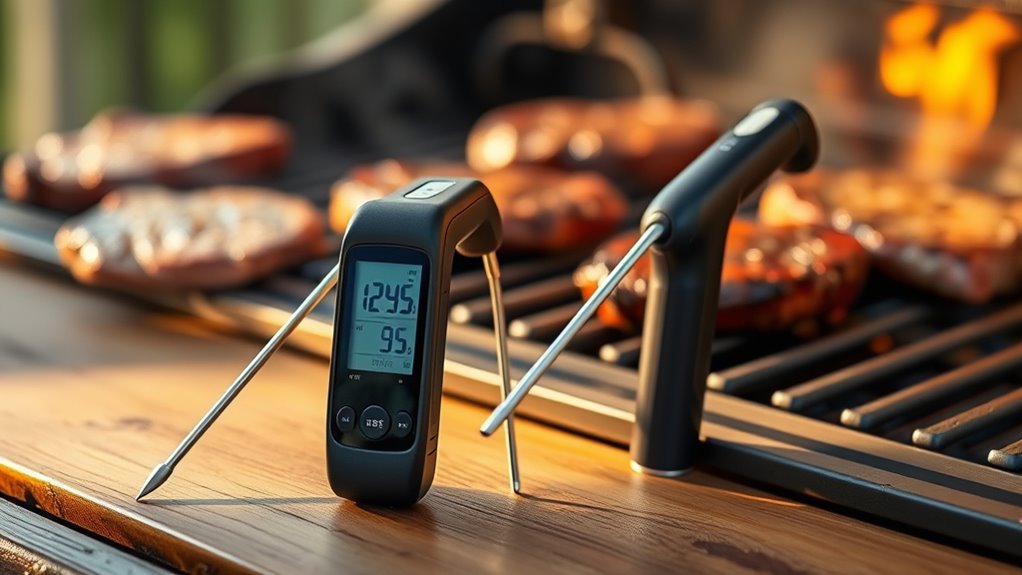 To guarantee perfectly cooked meat on the grill, I focus on choosing a thermometer that delivers accurate temperature readings within just a few degrees. Precise measurements are vital for avoiding under- or overcooking, which can ruin a good meal. I look for thermometers with calibration features or those that come with factory calibration reports to guarantee ongoing accuracy. Dual sensor or multisensor technology is also a plus, as it monitors both internal and ambient temperatures simultaneously, providing more reliable results. High-quality digital sensors tend to be more consistent than analog options, giving me confidence in each reading. Additionally, regular cleaning of the probe and following manufacturer instructions help maintain accuracy over time, ensuring my thermometers stay precise for many uses.