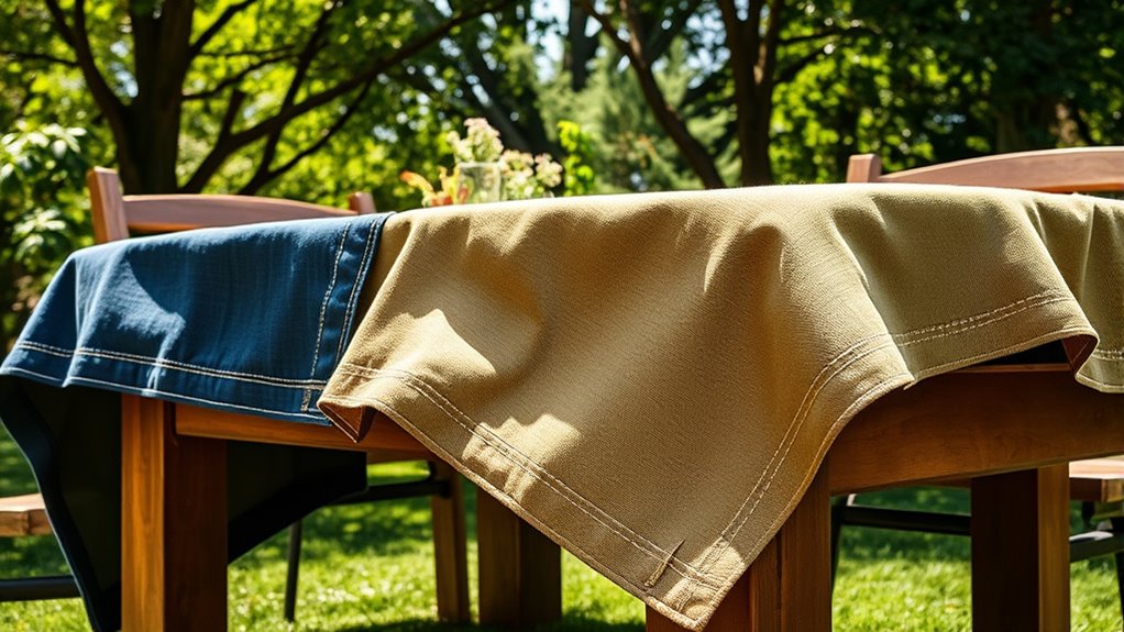 Choosing the right outdoor waterproof canvas fabric hinges on understanding its durability and strength. I look for fabrics with higher denier ratings, like 1200D, which offer better resistance to tearing and abrasion. Reinforced seams, triple-stitched hems, and metal grommets are key features that prevent ripping when the fabric faces stress. Water-resistant coatings such as polyurethane or fluorosilicone layers boost long-term resilience against moisture and environmental damage. The fabric’s natural fiber content, whether 100% cotton or polyester blends, also influences tensile strength and how well it withstands outdoor conditions. Keep in mind that UV exposure can weaken fabric over time, so UV-resistant treatments are essential to maintain durability. Overall, a combination of quality materials and construction ensures your outdoor canvas remains strong and lasting.