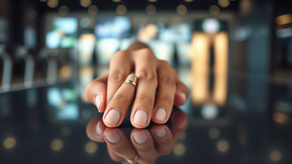 Choosing a smart ring for fitness tracking means considering not just its features but also how it looks and feels on your finger. A sleek, comfortable, and lightweight design guarantees you can wear it all day without discomfort. Style options range from minimalist, screenless titanium rings to more decorative ceramic or metallic finishes, allowing you to match your personal aesthetic. Material choices like titanium, ceramic, or stainless steel affect durability and appearance; some are hypoallergenic, ideal for sensitive skin. Proper sizing is essential for both comfort and accurate health data, so using sizing kits or measurements is a wise step. A discreet, unobtrusive design lets you wear the ring confidently in social or professional settings without feeling self-conscious.