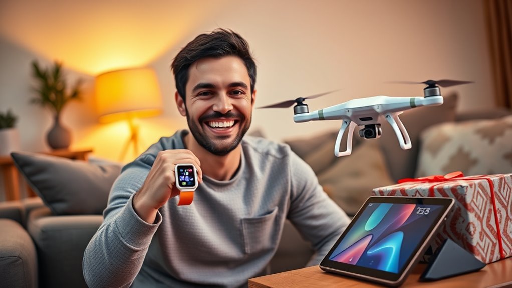 The latest innovative tech gadgets for dads in 2025 include smart home assistants that learn his routines, advanced fitness trackers with personalized health insights, and sleek augmented reality glasses for immersive experiences. I’ve also seen impressive portable solar chargers for outdoor adventures and smart wallets with anti-theft features. These gadgets combine functionality and fun, making them perfect gifts that show you care about his interests and needs.