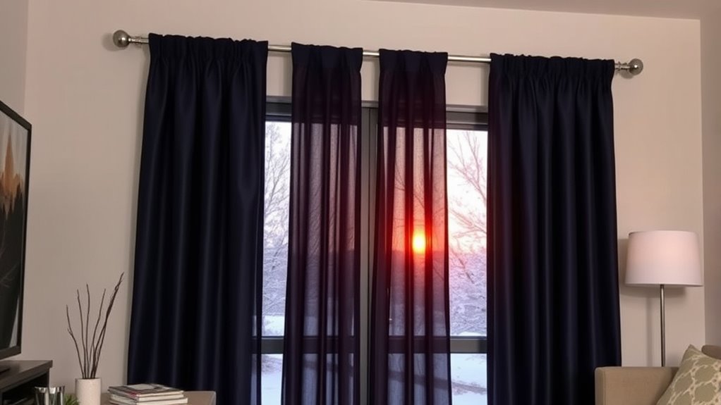 The light blocking power of thermal insulated curtain panels plays a vital role in creating a comfortable and energy-efficient space. It’s usually measured by the percentage of light they can block, from 60% to 99%. True blackout curtains block nearly 100%, preventing sunlight and UV rays, making them ideal for sleep or media rooms. Darker colors generally offer better light blocking than lighter shades, enhancing room darkness. The construction also matters; features like triple weave or blackout lining significantly improve light impeding capabilities. Proper installation is crucial—overlapping curtains and sealing gaps around the edges help maximize their effectiveness. When choosing a panel, consider the level of darkness you desire and ensure the curtains are installed correctly for optimal light blocking performance.