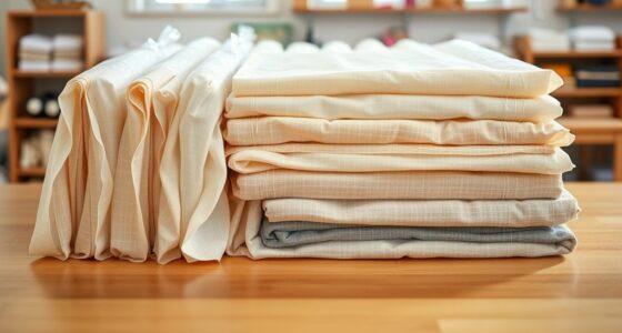 To keep my bulk zippers in top shape, I store them in a cool, dry place away from direct sunlight. I keep them in labeled, airtight containers or zip-lock bags to prevent dust and moisture damage. Before storing, I make sure they’re clean and free of debris. Regularly inspecting and handling them gently helps prevent bending or breaking, ensuring they stay functional for all my sewing projects.